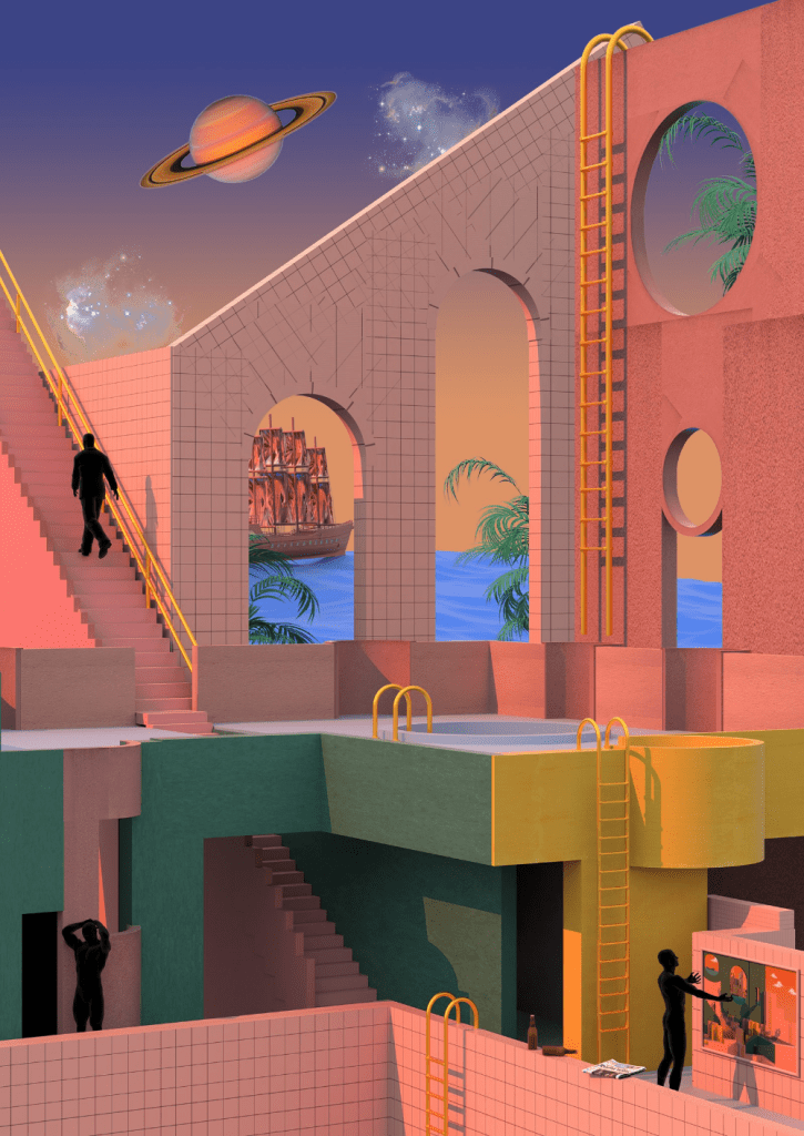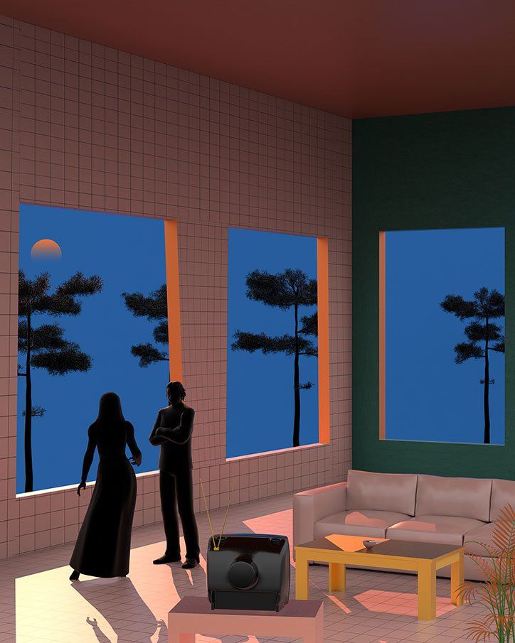 The Kurdistan artist present us a mix between luxury and a colorful designs. It feels like champagne and gold. His illustrations depict unknown men and women in their everyday lives. Mainly at home but also in restaurants, sometimes alone, we can feel their loneliness expression in their spacious rooms and collective houses. Those entities are black, we can’t distinguish their faces and any particular signs of difference. It’s maybe the aim of the artist : to inspire a sentiment of anonymity and an instant apperception from the viewers. Those personal scenes call us to rethink our ways of living. This 80’s kitsch colors and furnitures reminded me of 80’s TV shows and musical videos. The artist is drown by modern artistic features, from the 80’s until now, nature and cities are changing but humanity not really. We are transforming the outer world but our inner selves are shaping at a different pace . Tishk Barzanji’s illustrations are singular and prodigious, they describe us and our humanity through extravaganza spaces and deformed places. A fantastic world where everything we know is misplaced and has changed. Planets and the sky are no longer far from us. They are a part of our lives. It’s advanced, conceptual and authentic. It’s about you and me and a possible futur which seems complex but magical. It’s surrealistic.
