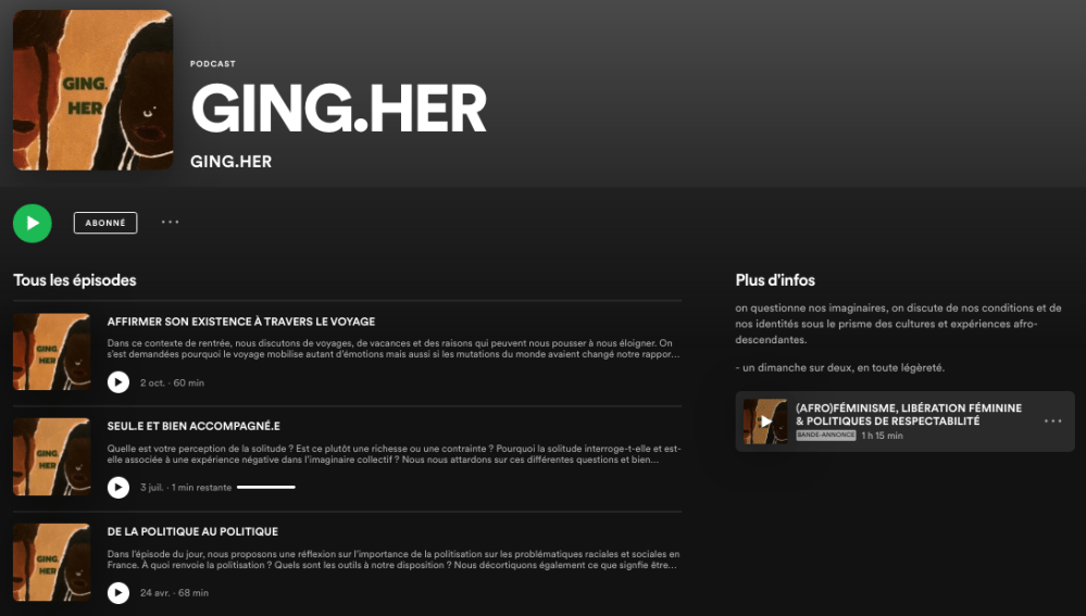 Tata – Nos inspirations, en termes de podcasts déjà il y a du coup Bobo & Flex, c’est un podcast qui a duré deux ou trois ans. C’était aussi deux femmes afrodescendantes, une aux Etats-Unis et l’autre en Australie qui enregistraient et c’était un peu le même format que Ging.Her sauf que le leur était anglophone et on voulait vraiment quelque chose de francophone parce que dans nos conversations, on ressentait beaucoup qu’on parlait de podcasts, mais c’était toujours en anglais et les podcasts français, c’était une génération au-dessus un peu.