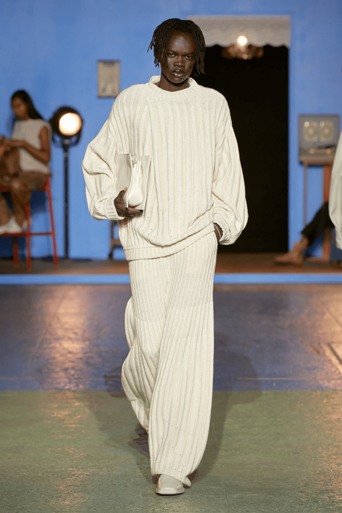 La jeune et affirmée créatrice britannique Bianca Saunders, propose un saut hors du temps, où les mannequins prennent le temps, comme au théâtre, de se dévoiler au fil de murmures et de rencontre. Les pièces elles sont de tons neutres et pastels, les coupes minimales mais aussi oversized et asymétriques. Un confort stylisé et géométrique. On est conviés à une rencontre douce, accompagnée d’une discussion intimiste et chaleureuse, à l’image des créations.