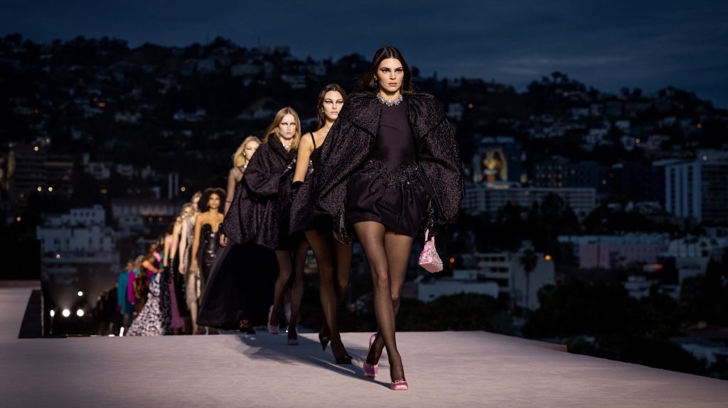 Direction Los Angeles pour le défilé Versace. Le défilé est ouvert par la mannequin américaine, Kendall Jenner, la collection se dévoile dans une multitude de looks noirs, chic et rappelant les années 60. Hanches pulpeuses, tailles marquées, gants et boutons, la collection se veut sexy et élégante. Puis on avance et un fil de couleurs et matières se dessine : cuir croco, jeans ou robe ultra courte ou à col oval, la collection se joue sur les motifs et des accessoires qui compliment sans prendre la place. Accompagnées de massifs eye-liners, l’inspiration presque pin-up et dolce vita est très assumée.