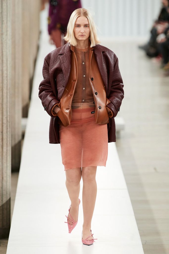Déjantée et presque chronométrique, la collection automne/hiver de la maison italienne est rythmée par un stress ambient, comme une rentrée de septembre dans un quartier d’affaires. La collection est galvanisée par des pièces strictes et formelles. D’entrée de jeu, les mannequins défilent comme dépassées, pressées, devant s’assurer d’être à l’heure et remplir leurs missions. Blazers en chevrons, cardigans, micro talons ou mini sacs à mains matelassés, le mot d’ordre est une discrétion ordonné. Cette sévérité contraste avec l’allure et les looks parfois incomplets : on rentre dans le jeu de quelque chose d’inachevé mais qui se prend au sérieux. Des bas non mis, des cheveux en pétard, transparence et asymétrie, on dérange sans faire de bruit, une révolution vestimentaire aphone mais qui résonne tout de même. La colorimétrie tourne autour de saisons automnales : corail, vert kaki, violet ou vert canard, rien est terne mais rien n’est trop voyant.